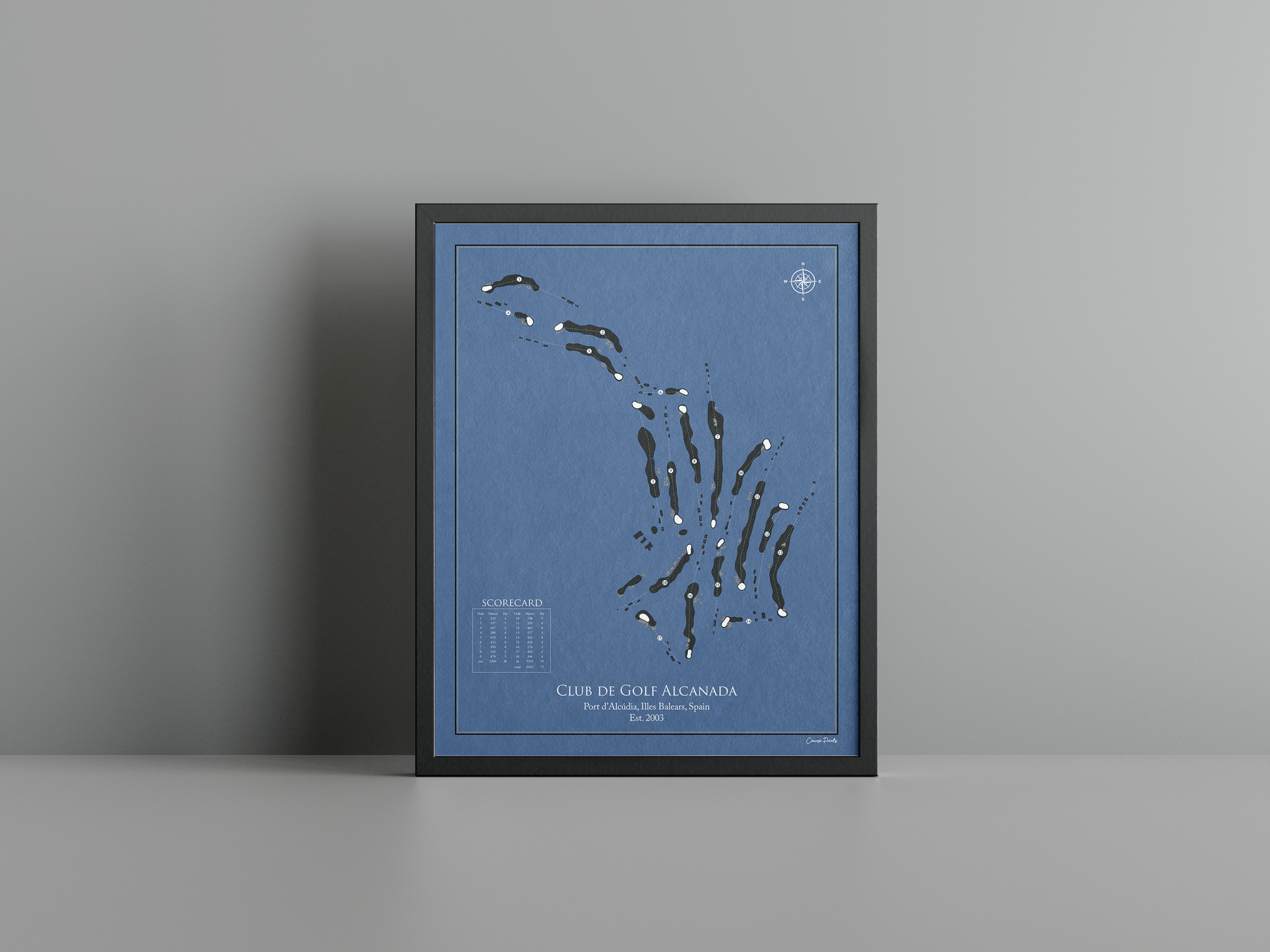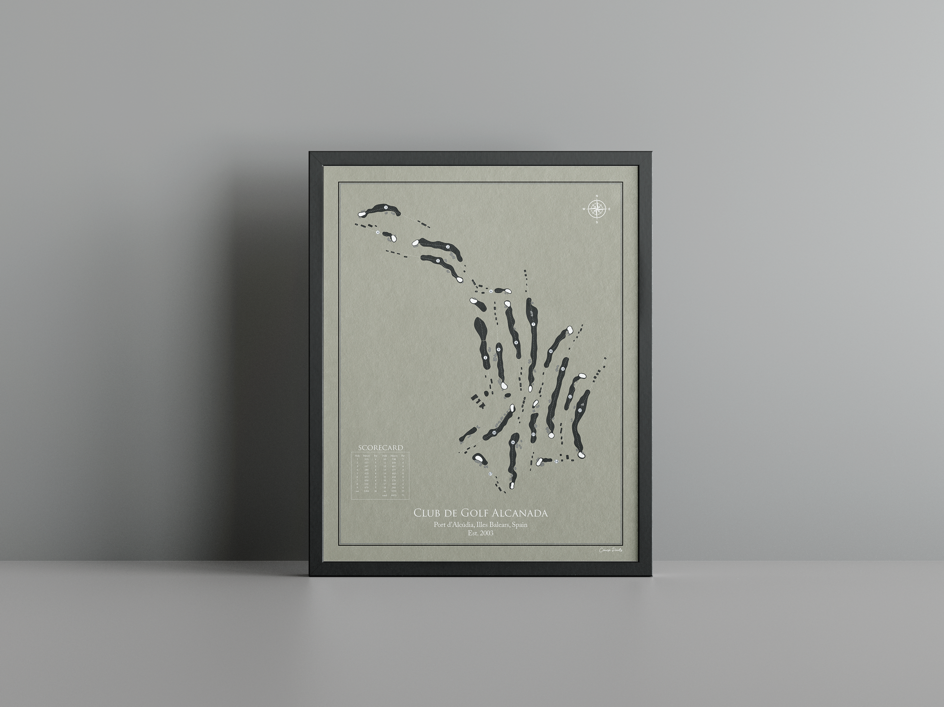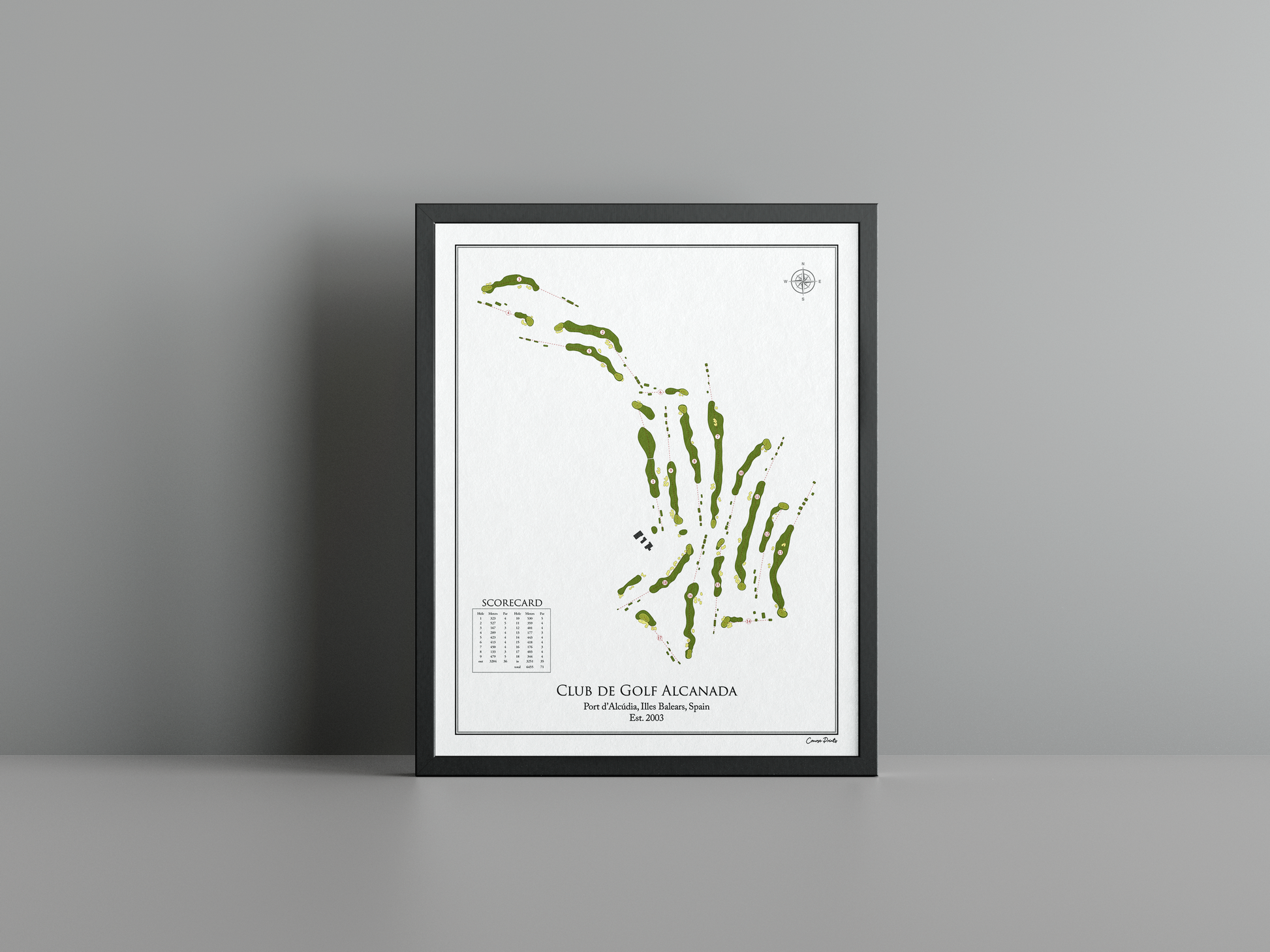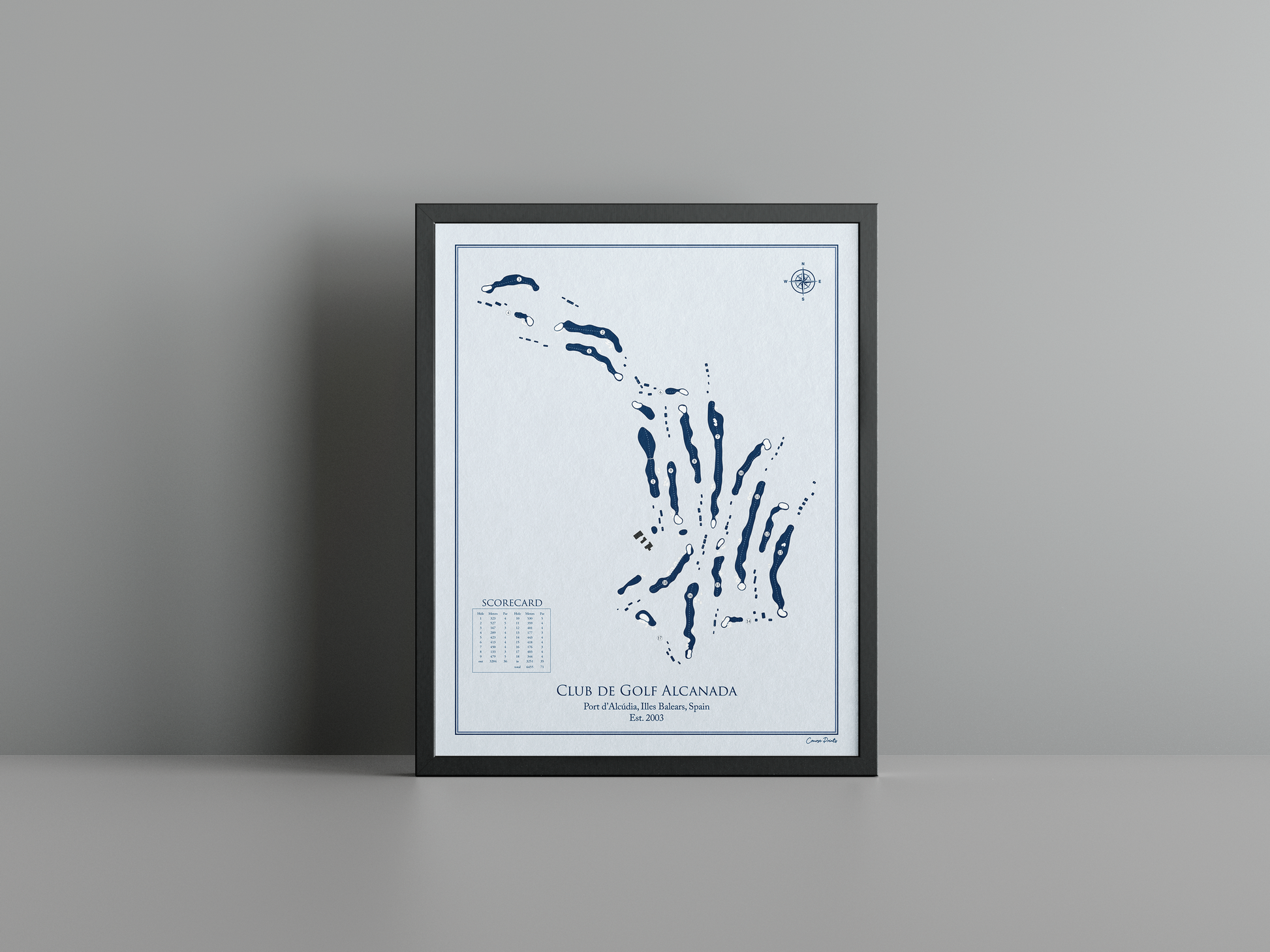 Discover the timeless charm of coastal golf with a premium Course Print of Club de Golf Alcanada. Nestled in the picturesque Port d’Alcúdia in the Illes Balears, this stunning course, established in 2003, is a true celebration of the Mediterranean landscape. With its links-style layout, Alcanada is shaped by gentle coastal breezes and the undulating terrain that meanders toward the sparkling waters of the bay. Towering pines and native flora frame the fairways, creating a serene yet challenging environment that invites golfers to engage with nature while testing their skills.