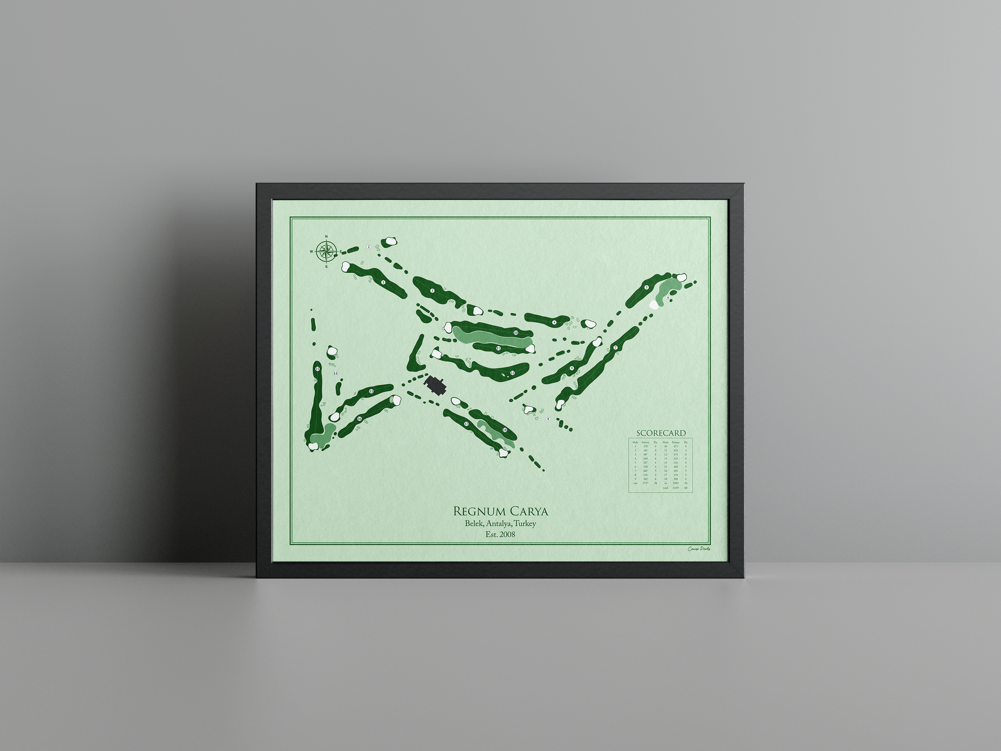 Discover the elegance and challenge of the Carya Golf Club with a premium Course Print that encapsulates the spirit of this exceptional course. Nestled in the stunning landscape of Belek, Antalya, Turkey, Carya Golf Club harmoniously blends its lush surroundings with beautifully crafted links-style design, offering golfers a unique experience since its establishment in 2008. The course is characterized by undulating terrain, expansive views of the Mediterranean, and strategically placed bunkers that are shaped by both the natural contours of the land and the gentle, sometimes brisk, coastal winds.