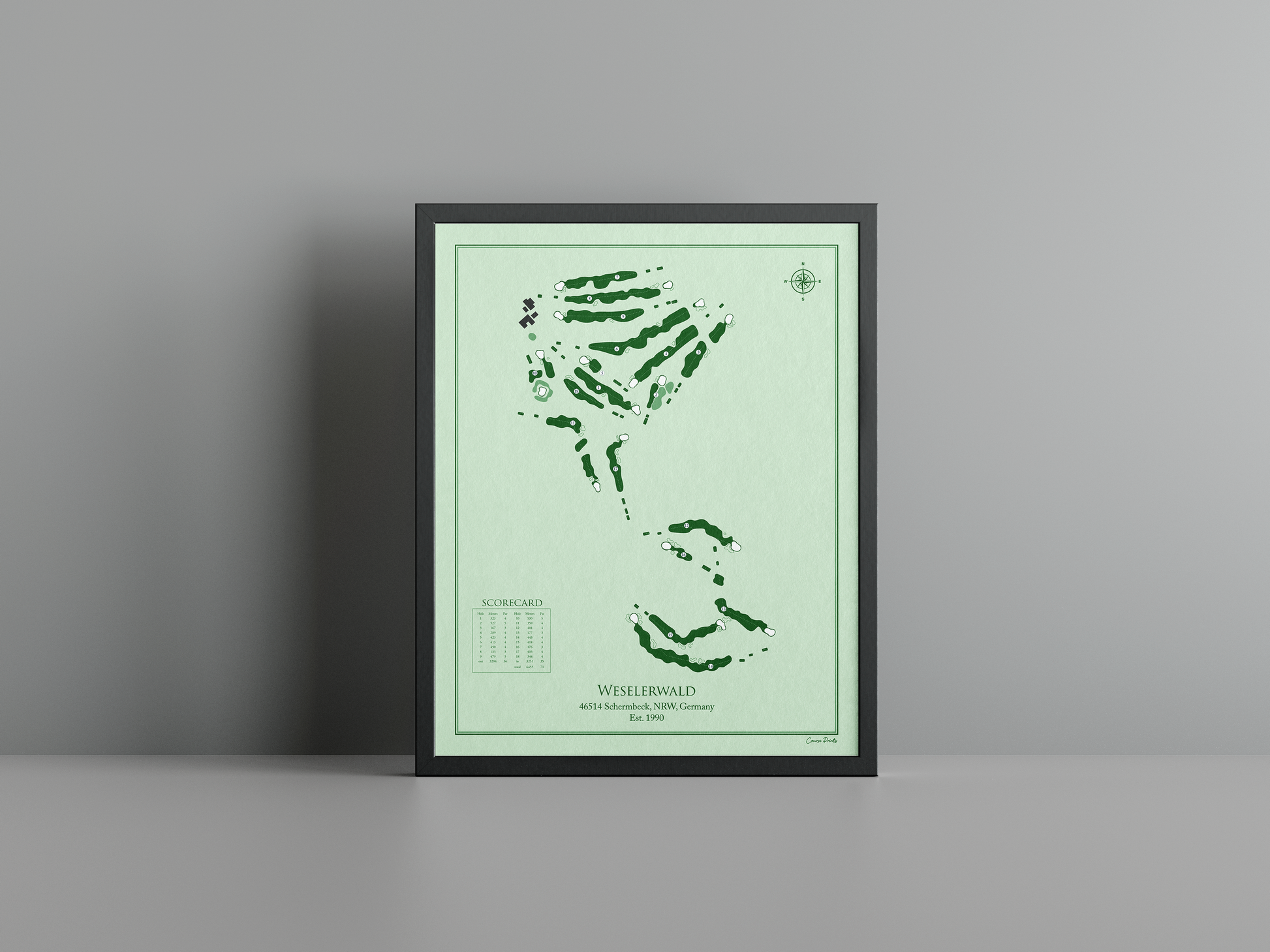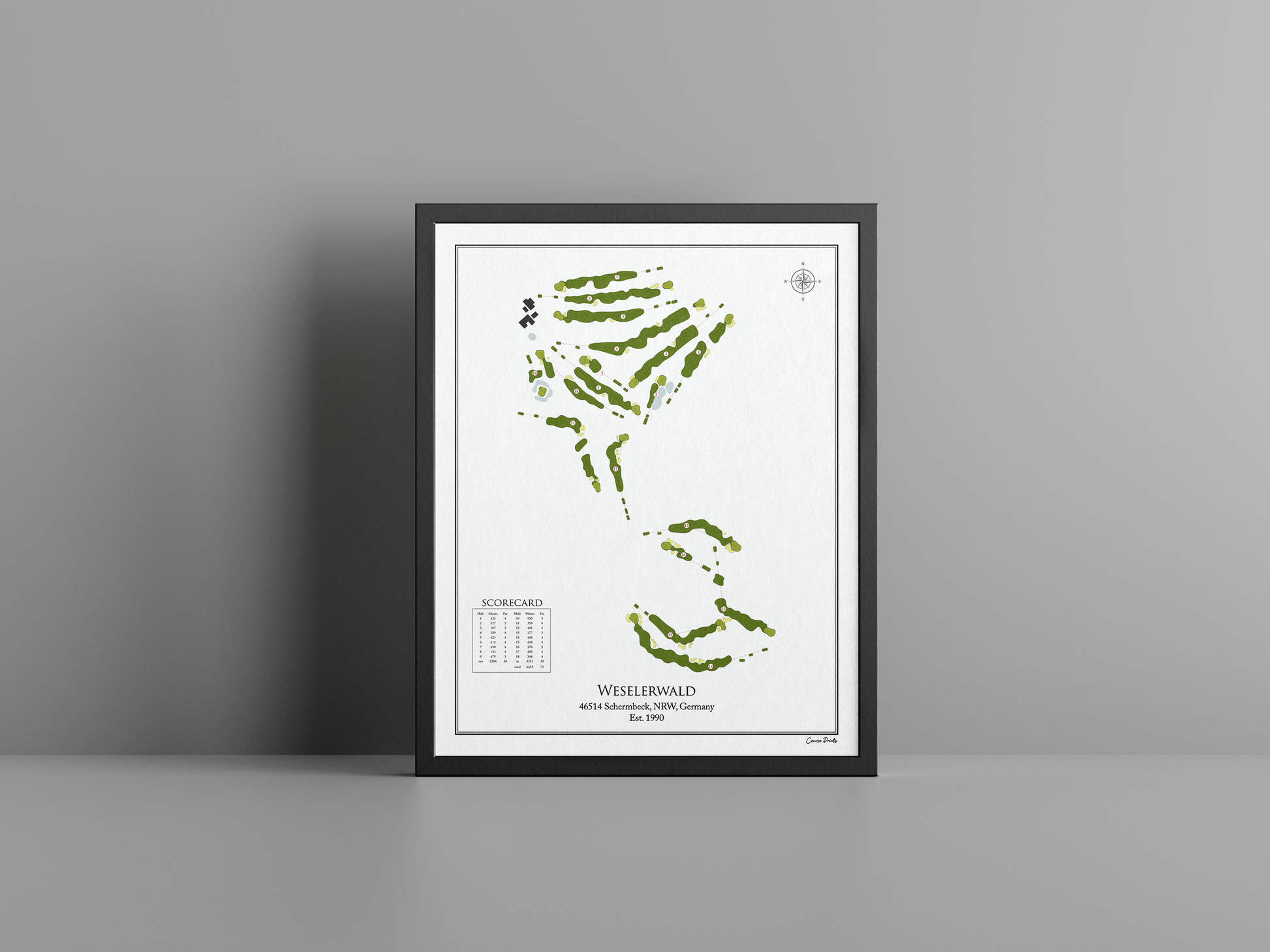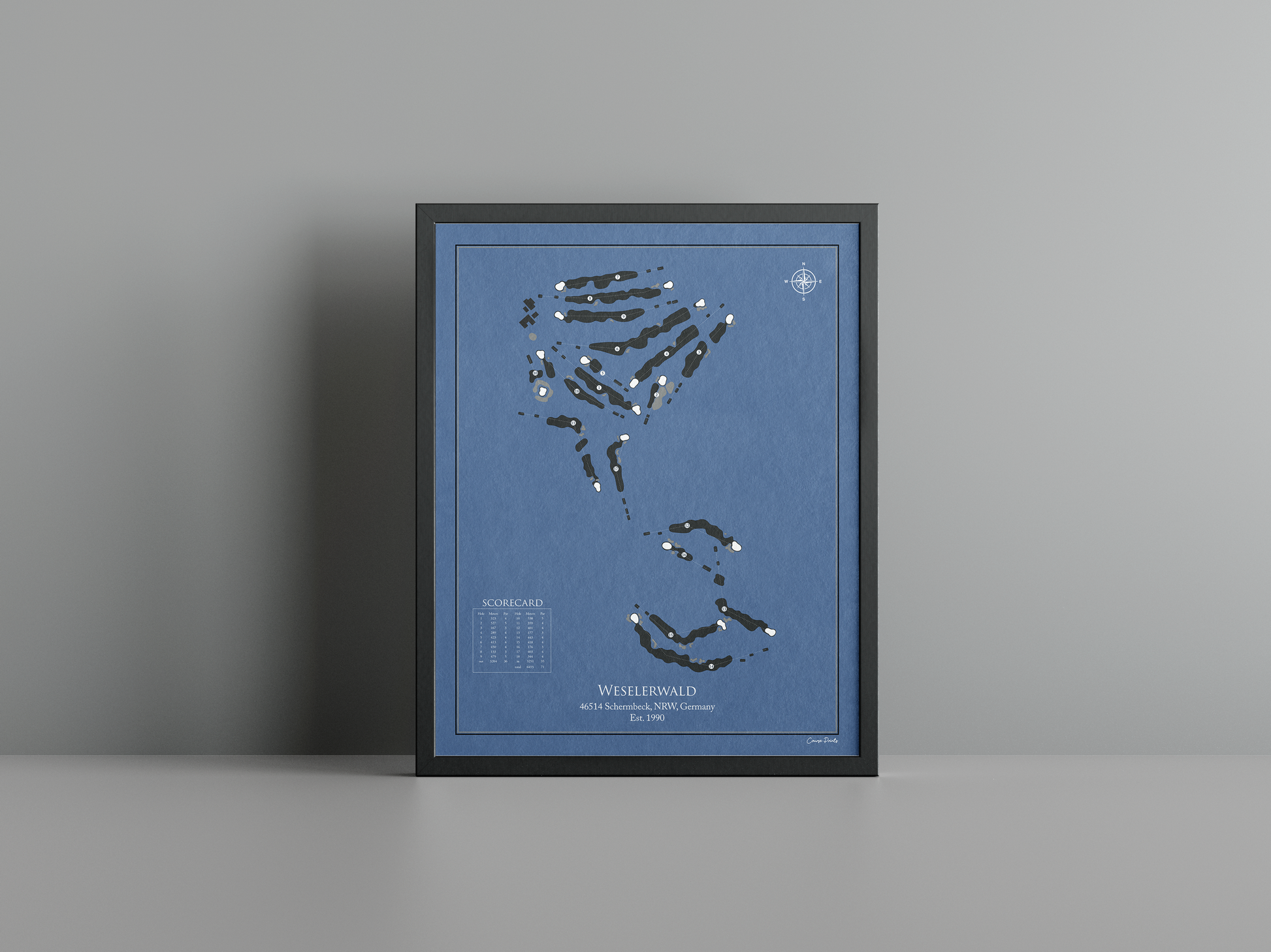 Our 18-Loch-Platz Course Print captures the stunning landscape and the spirit of this remarkable course. It serves as an inspiring reminder of the challenges faced and the beauty found in every round. Perfect for anyone who has played at Weselerwald, loves the serene elegance of German golf, or desires a striking piece of art to evoke memories of this beautiful course.